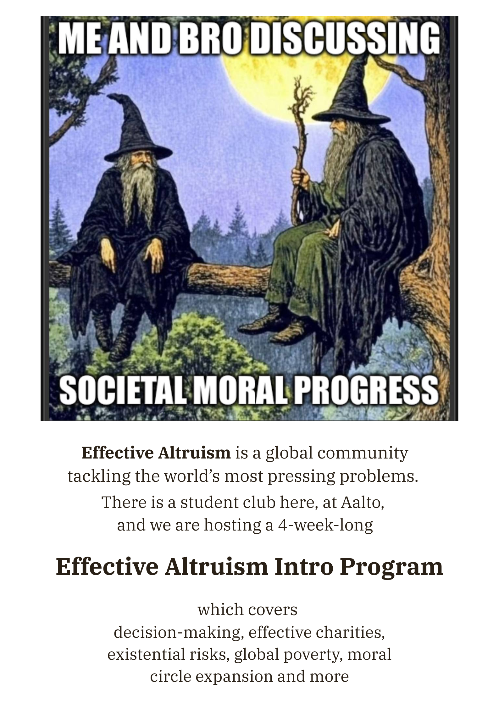 Join Aalto Effective Altruism in our mission to help people make a difference. Our community at Aalto University provides valuable resources and guidance to students and staff seeking to address the most pressing issues of our time. Which global challenges require the most urgent attention? What approaches are the most effective in solving them? And how can we best utilize our skills and resources to make a positive impact?